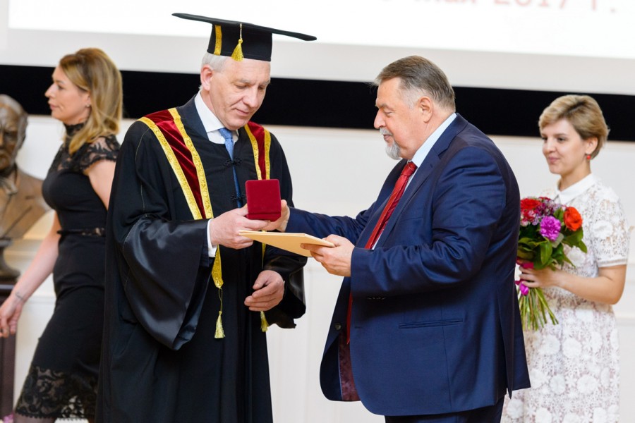 Медаль, свидетельствующую о присвоении этого почетного звания, на торжественной церемонии вручил председатель Ученого совета и президент Пироговского Центра Юрий Леонидович Шевченко.