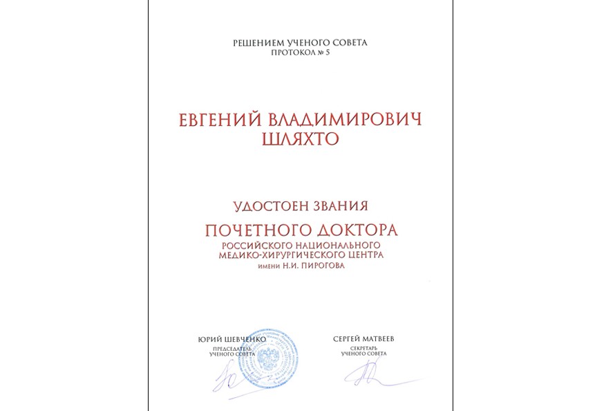 Евгений Владимирович Шляхто — генеральный директор Северо-Западного федерального медицинского исследовательского центра им. В. А. Алмазова, академик РАН, Заслуженный деятель науки РФ, генеральный директор ФГБУ «СЗФМИЦ им. В. А. Алмазова» Минздрава России, президент Российского кардиологического общества, главный кардиолог Санкт-Петербурга и Северо-Западного федерального округа, — удостоен звания «Почетный доктор» Российского национального медико-хирургического центра имени Н. И. Пирогова.