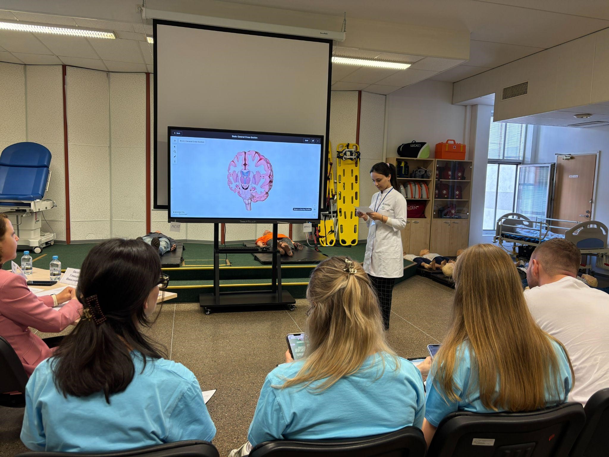 Уже на старте был отмечен успех Южно-Уральского ГМУ, победившего в конкурсе «Видеовизитка». Программа началась в инновационном симуляционном центре НМИЦ, где участники показывали на 3D модели очаг поражения головного мозга, демонстрировали навыки неврологического осмотра и впервые отрабатывали спасение пациента на уникальном манекене.