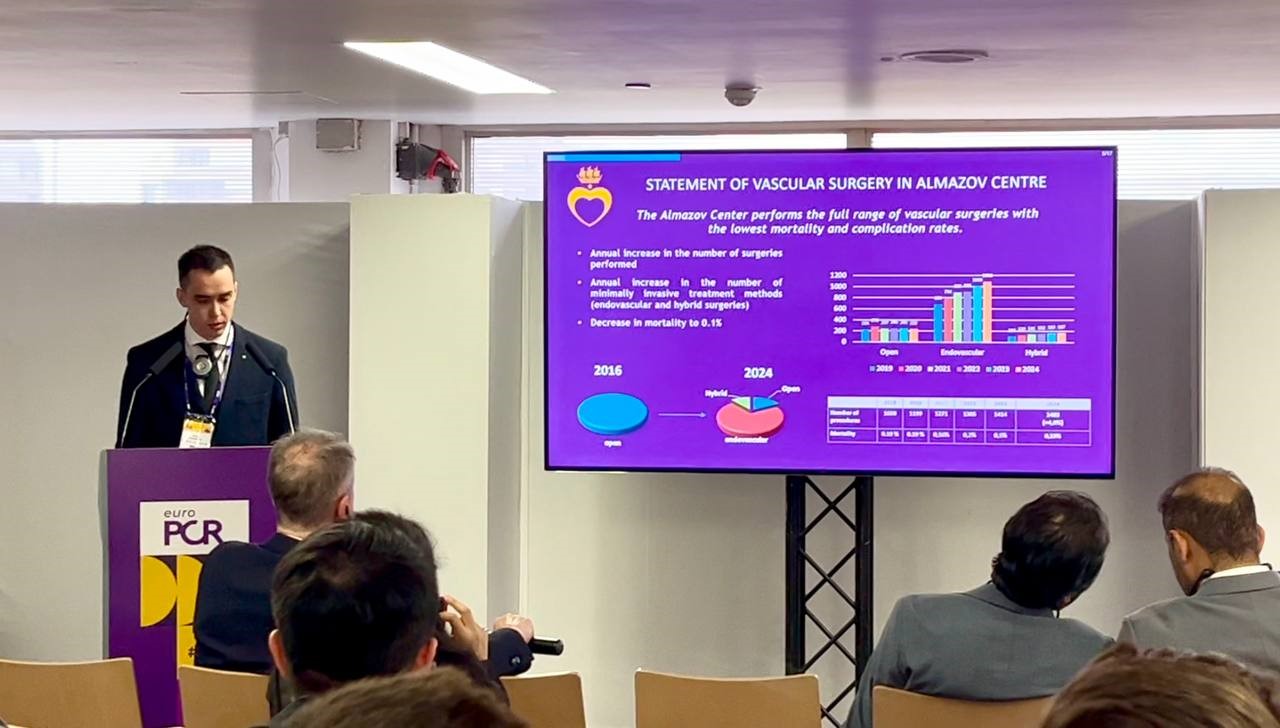 На международном курсе по интервенционной сердечно-сосудистой хирургии (PCR 2025) в г. Париже, объединившем более 12 тысяч участников с 20 по 23 мая, научный сотрудник А.Г. Ванюркин выступил с двумя устными докладами, представив опыт лечения более 3000 пациентов с поражением внутренних сонных артерий в Центре Алмазова, а также результаты эндопротезирования окклюзий терминального отдела аорты. Помимо этого, на мероприятии было представлено два электронных постера, в которых освещены отдаленные результаты гибридного лечения многоуровневых поражений периферических артерий. Современные возможности эндоваскулярной и гибридной хирургии Центра Алмазова были высоко оценены членами президиума.