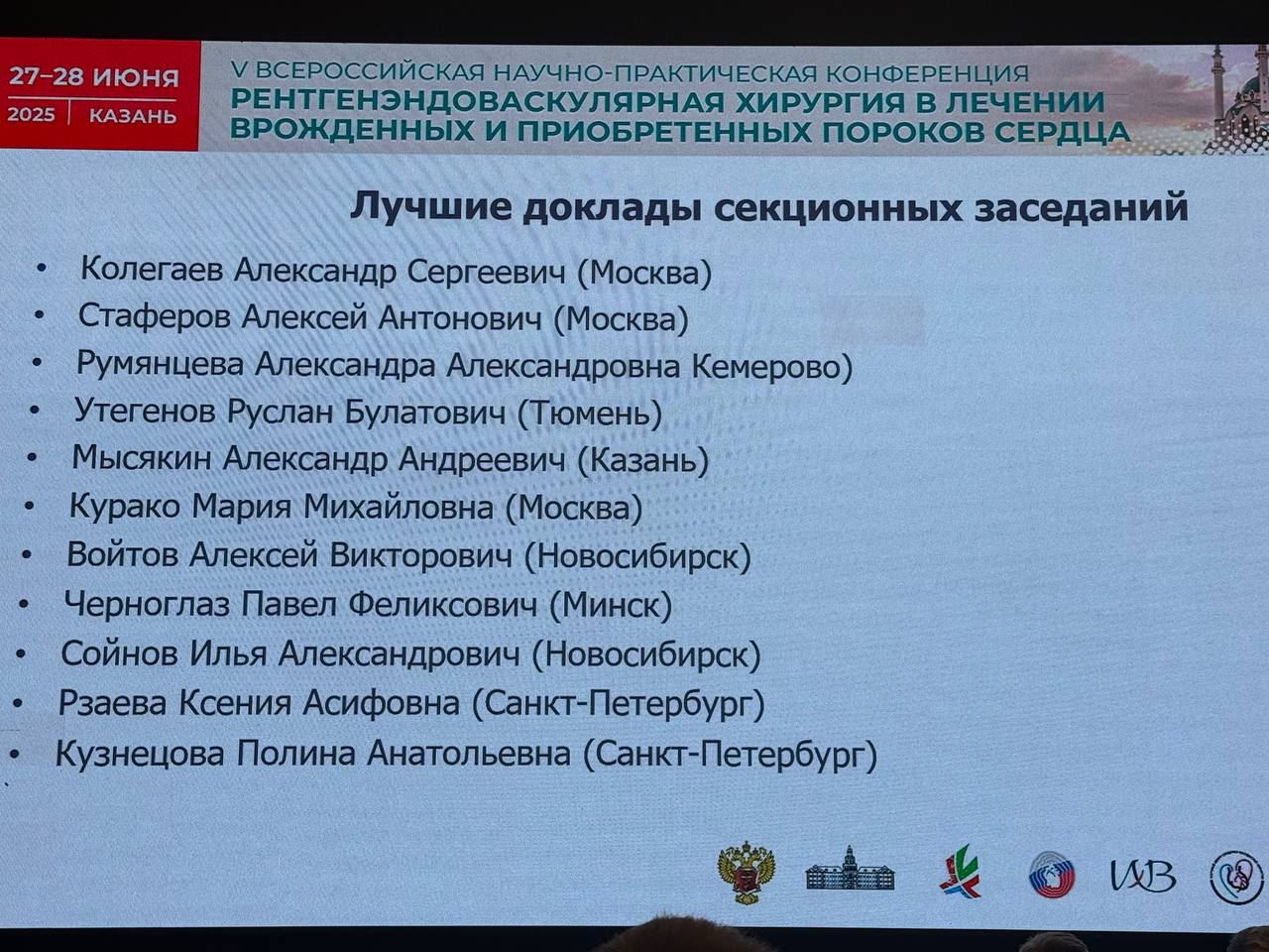 На следующий день команда НИЛ отправилась в Казань для участия в V Всероссийской научно-практической конференции «Рентгенэндоваскулярная хирургия в лечении врожденных и приобретенных пороков сердца», которая проходила с 27 по 28 июня 2025 года. Сотрудники лаборатории стали активными участниками научной программы, представив 11 докладов на пленарных и секционных заседаниях. Основные темы включали современные подходы к лечению структурных заболеваний сердца, интервенционные и гибридные технологии.