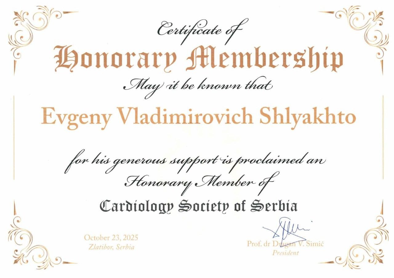 Евгений Владимирович Шляхто был удостоен звания почетного члена Сербского кардиологического общества в знак признания его выдающегося вклада в развитие кардиологической науки.