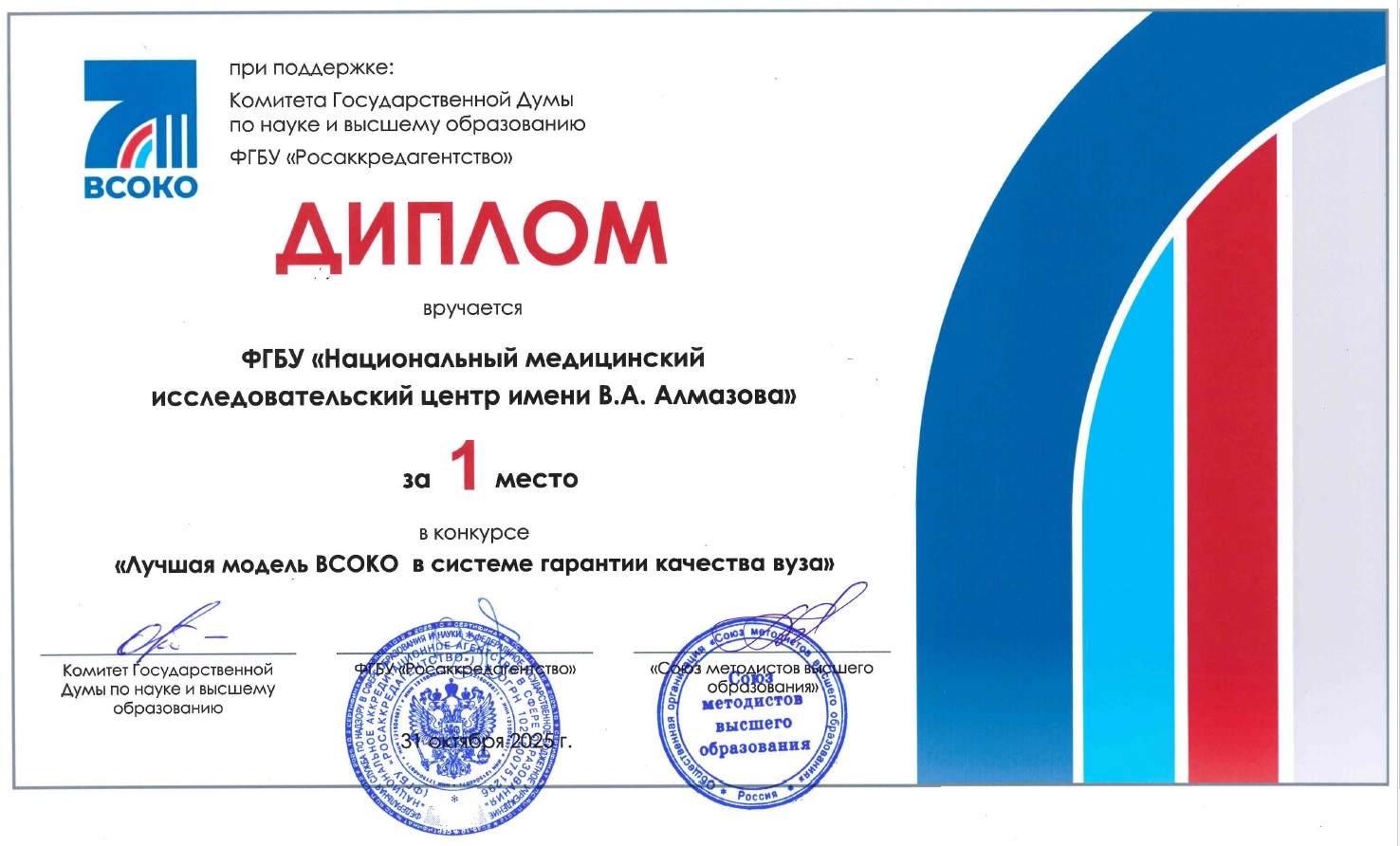 В результате внутренняя система оценки качества образования Центра Алмазова была признана одной из лучших в стране. Полученные в ходе конкурса результаты станут важным ориентиром для развития систем оценки качества в российских вузах.