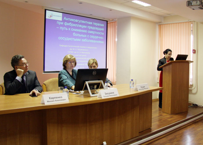 С докладами выступили доцент кафедры госпитальной терапии и кардиологии СЗГМУ им. И. И. Мечникова, руководитель городского аритмологического центра Т. Н. Новикова (Антикоагулянтная терапия при фибрилляции предсердий — путь к снижению смертности больных с сердечно-сосудистыми заболеваниями), зав. кафедрой клинической лабораторной диагностики и генетики СЗФМИЦ им. В. А. Алмазова Т. В. Вавилова (Лабораторные модели организации антикоагулянтного мониторинга), заместитель главного врача по медицинской работе СПБ ГБУЗ ГП № 120, Милашевич М. П. (Практическая реализация программы создания антикоагулянтного кабинета в ГБУЗ ГП № 120), генеральный директор компании «Антикоагулянтная клиника» (Москва) к. м. н. М. В. Болотин (Компьютерные решения в антикоагулянтном мониторинге).