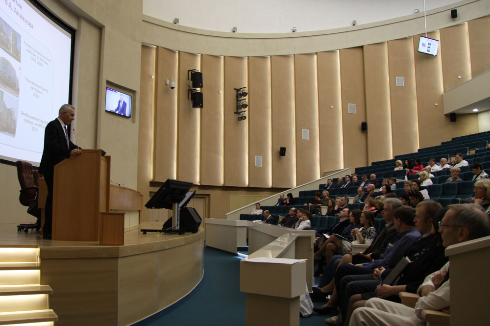 Генеральный директор академик РАН Е. В. Шляхто представил вниманию доклад «О стратегии развития ФГБУ «Северо-Западный федеральный медицинский исследовательский центр имени В. А. Алмазова» Минздрава России на 2016—2018 годы» и поздравил всех с наступающим новым годом.