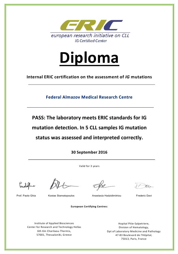 В сентябре 2016 года лаборатория НИЛ онкогематологии успешно прошла сертификацию Европейского общества изучения хронического лимфолейкоза (ERIC) для оценки мутационного статуса генов тяжелой цепи иммуноглобулинов у пациентов с ХЛЛ. На данный момент Центр Алмазова — единственное учреждение в России, получившее такой сертификат.