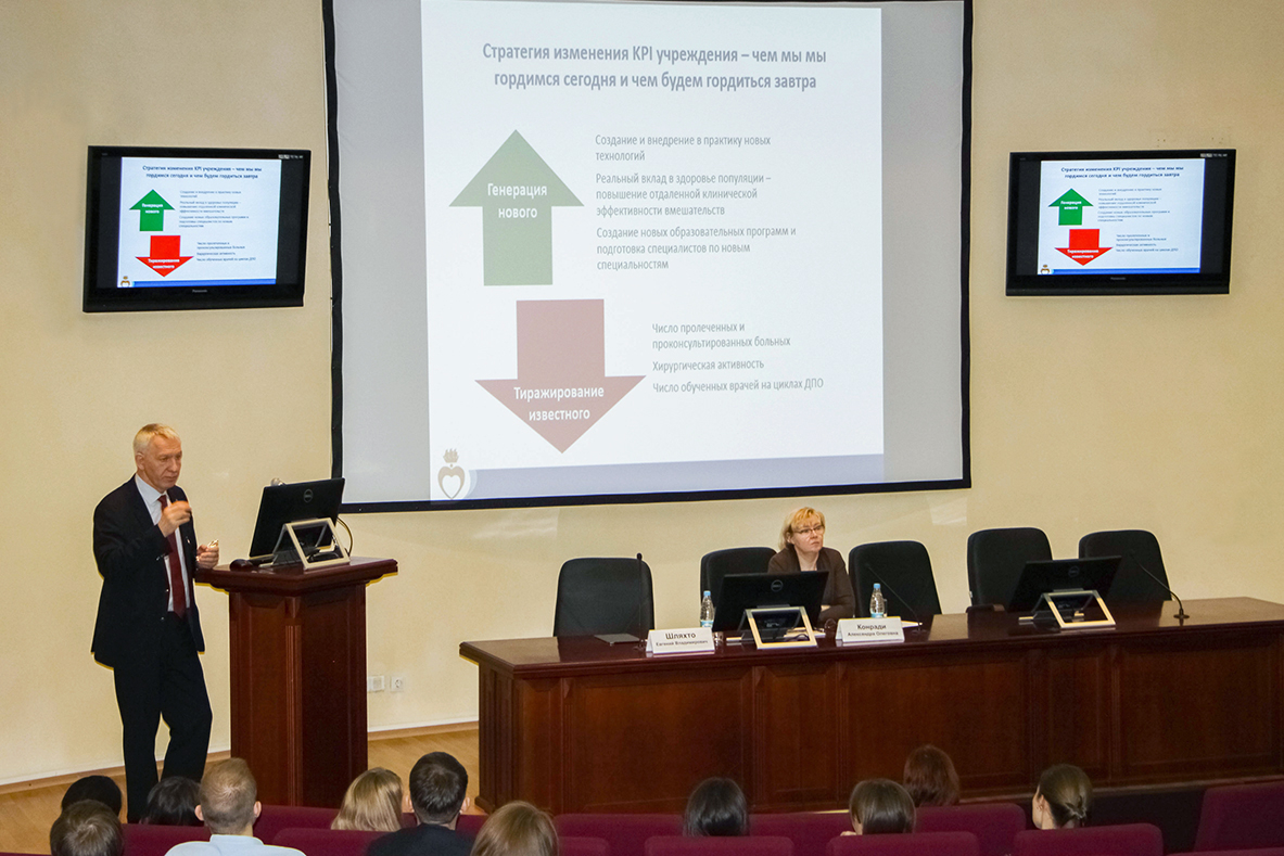 С приветственными докладами выступили генеральный директор СЗФМИЦ им. В. А. Алмазова, д. м. н., проф., академик РАН Евгений Владимирович Шляхто и заместитель генерального директора по научной работе, д. м. н., проф., член-корреспондент РАН Александра Олеговна Конради.