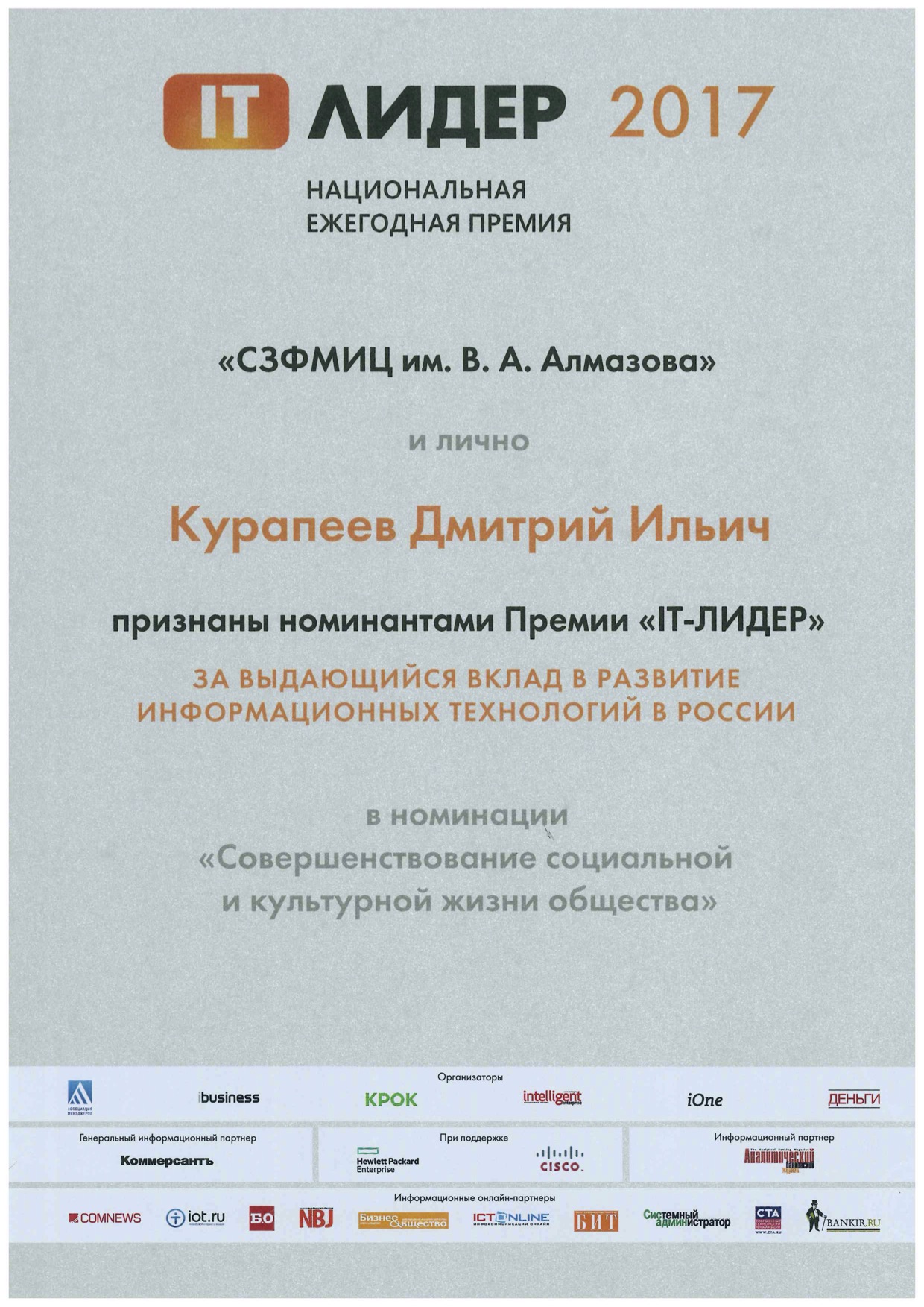 Под руководством Дмитрия Ильича Курапеева в ФГБУ «СЗФМИЦ им. В. А. Алмазова» Минздрава России был организован телемедицинский консультативный центр, который включает в себя переговорную зону на восемь мест с системой видео-конференц-связи для проведения дистанционных совещаний и шесть рабочих мест врачей-консультантов. С их помощью врачи могут проводить телемедицинские консультации, участвовать в видеоконференциях с лечащими врачами и в видеоконсилиумах с привлечением других специалистов.