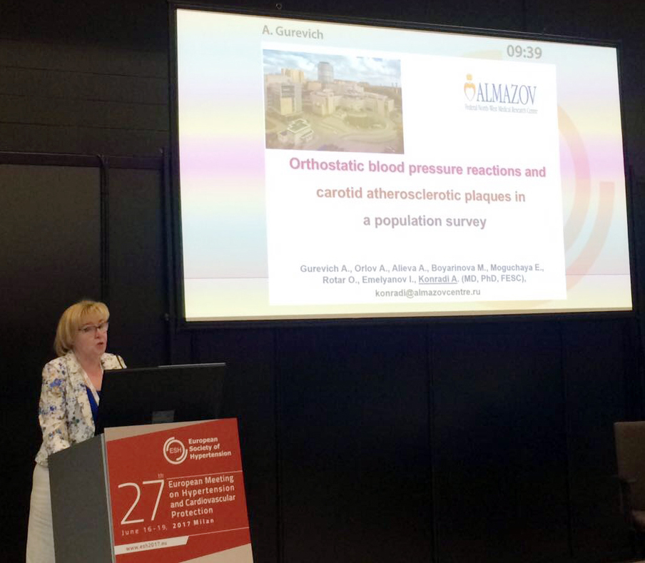 Профессор А. О. Конради представила данные анализа эпидемиологического исследования ЭССЕ-РФ по взаимосвязи ортостатических реакций и признаков атеросклероза сонных артерий.