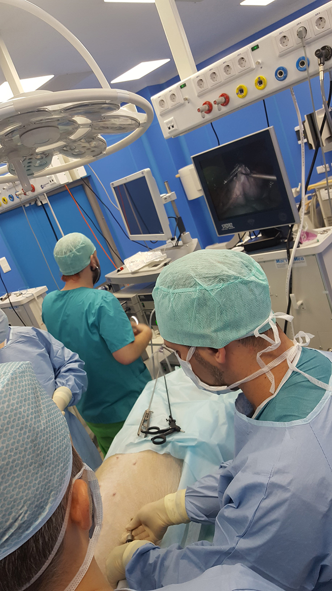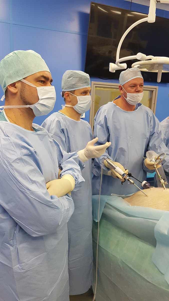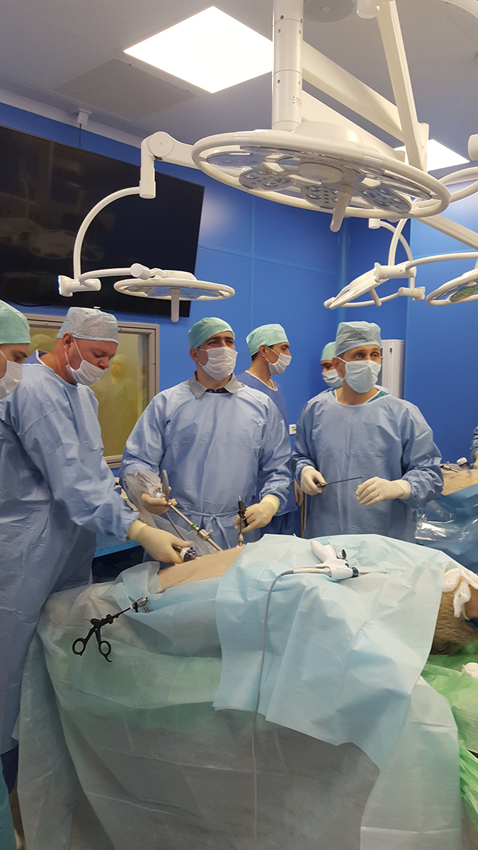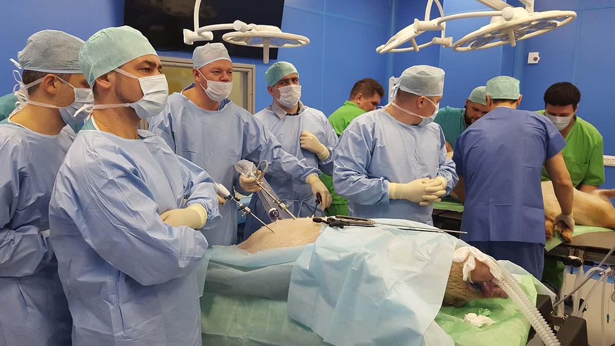 В рамках практики в экспериментальной операционной хирургами на крупных лабораторных животных были отработаны принципы наложения аппаратного шва, работа с современными сшивающими аппаратами и инструментами для разделения тканей, принципы ТМЕ, СМЕ, оперативные приемы и технические детали операций (продольная резекция желудка, бандажирование желудка, различные виды шунтирующих операций, лапароскопические правосторонняя и левосторонняя гемиколэктомии, миниинвазивные резекции прямой кишки, трансанальных резекций прямой и ободочной кишки).