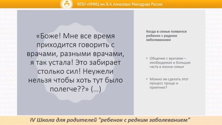 19 декабря в рамках IV Междисциплинарной конференции «Орфанные заболевания. Диагностика. Лечение. Реабилитация» традиционно состоялась IV Школа для родителей «Ребенок с редким заболеванием». В этот раз мероприятие было посвящено организационным аспектам получения медицинской помощи в условиях пандемии и психологическим вопросам взаимодействия с врачами и жизни семьи с ребенком с редким заболеванием.