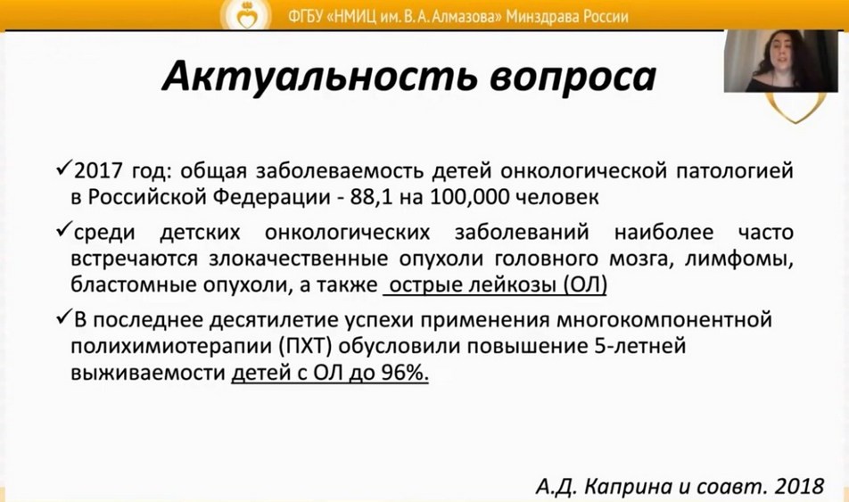 17 марта 2021 года в Центре Алмазова в формате онлайн состоялась IV Ежегодная конференция «Высокие технологии в гинекологии детского и раннего репродуктивного возраста». Открывая конференцию, директор Института перинатологии и педиатрии НМИЦ им. В. А. Алмазова д.м.н. Т. М. Первунина отметила, что Центр Алмазова ставит особые задачи перед службой гинекологии детей и подростков, состоящие в необходимости изучения репродуктивного здоровья детей с заболеваниями репродуктивной системы у девочек с хронической соматической патологией. Среди таких пациенток девочки с хронической сердечной недостаточностью, после трансплантации сердца, с тяжелыми аритмологическими проблемами, а также проходящие лечение по эндокринному профилю. И крайне важно сохранить репродуктивные функции среди этих пациенток, проводя медико-генетическое консультирование.