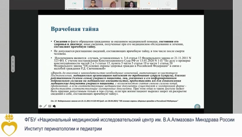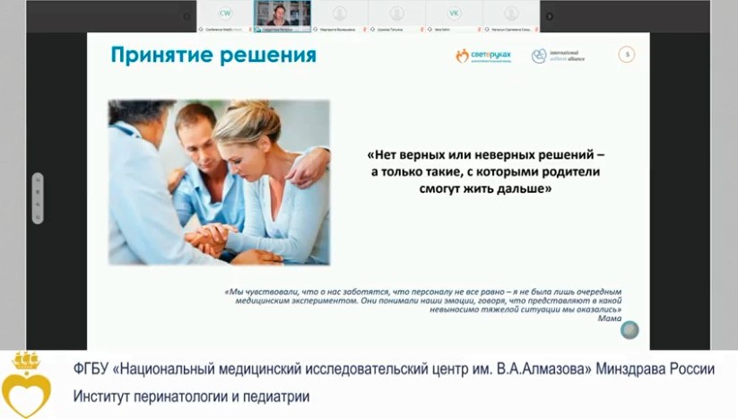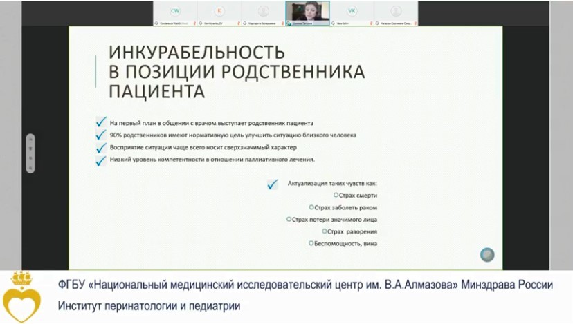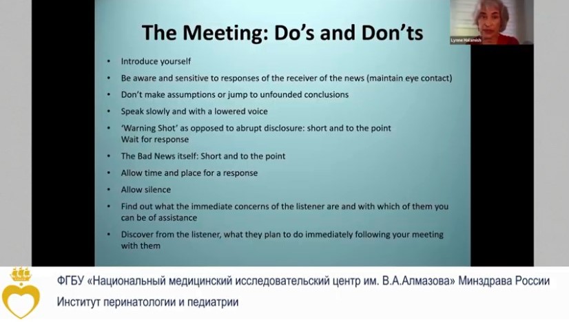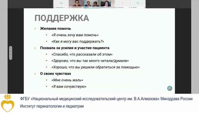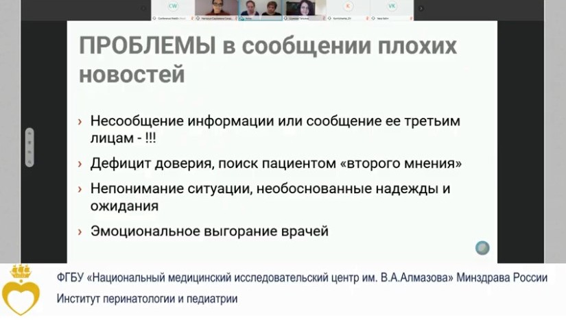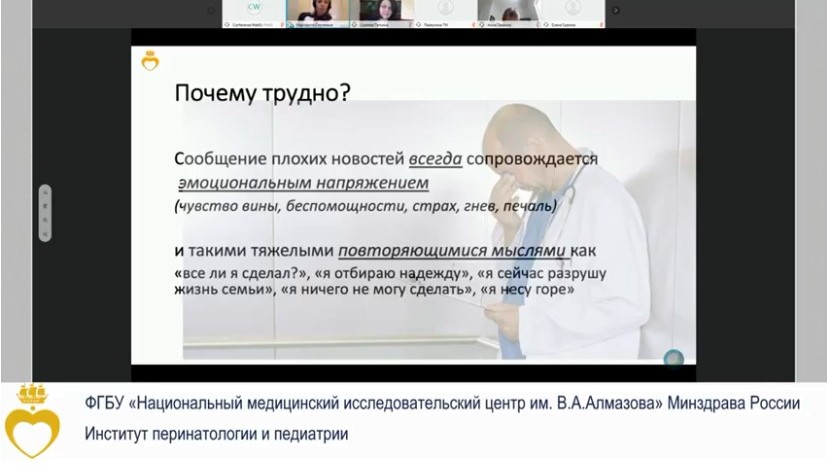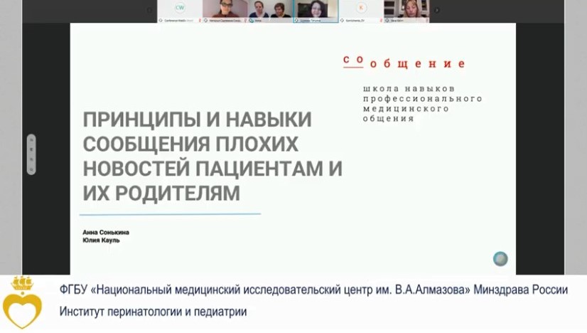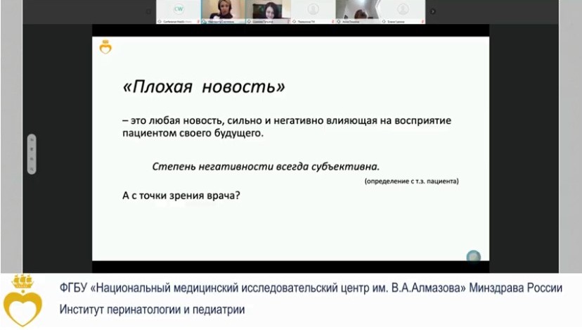 Институт перинатологии и педиатрии и специалисты отделения психолого-социального сопровождения материнства и детства Центра Алмазова 21 мая провели практическую онлайн конференцию с международным участием «Сообщение плохих новостей и сложные разговоры в медицине».