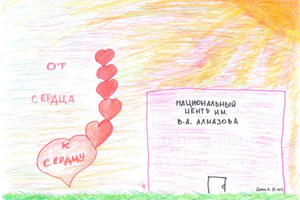 Сотрудники отделения психолого-социального сопровождения материнства и детства провели творческий конкурс для детей, проходящих лечение в Центре Алмазова. Каждый рисунок, на котором изображены разноцветные огоньки кардиомониторов, ветки цветущих деревьев и добрые руки врачей, протягивающие улыбающиеся сердечки, помогает взрослым увидеть сердце глазами ребенка. Рисунки стали подарками докторам, которые ежедневно трудятся для сохранения и улучшения работы главного человеческого органа.