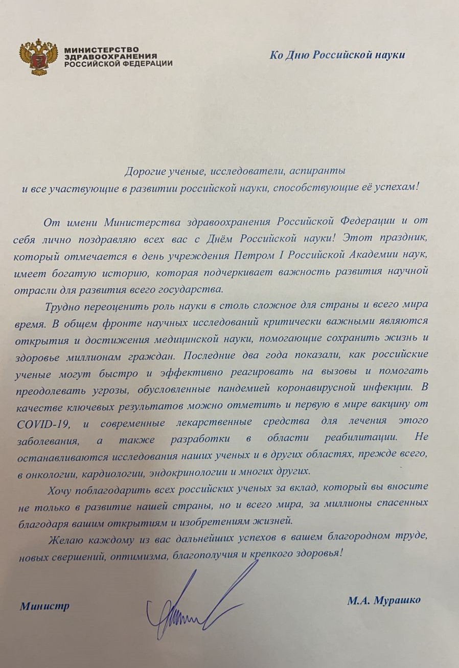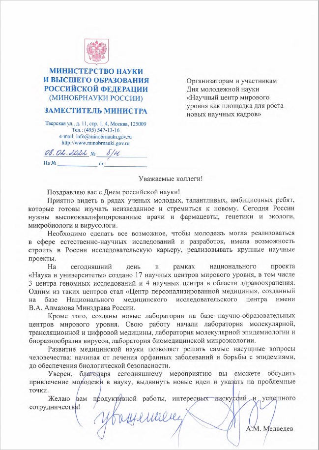 8 февраля в Точке кипения Центра Алмазова прошел День науки. В целях предупреждения распространения новой коронавирусной инфекции COVID-19 мероприятие состоялось в онлайн-формате, оно включало уникальные лекции от известнейших представителей научного сообщества Центра Алмазова. С приветственным словом к участникам обратился министр здравоохранения Российской Федерации Михаил Альбертович Мурашко, выразив признательность российским ученым за миллионы спасенных, благодаря их открытиям и изобретениям, жизней. Также участников поприветствовал заместитель министра науки и высшего образования Российской Федерации Алексей Михайлович Медведев. Алексей Михайлович отметил возрастающую важность привлечения молодежи к науке, выдвижения новых оригинальных идей и подготовки высококвалифицированных кадров в сфере медицины и здравоохранения.