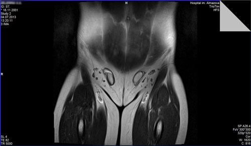 НФП – полная форма резистентности к андрогенам. МРТ органов малого таза (тестикулы в паховых каналах) у фенотипически девочки с кариотипом 46ХУ. |