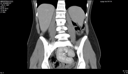 Синдром Рокитанского-Кюстнера-Майера-Хаузера у девочки 16 лет с первичной аменореей. МРТ органов малого таза. (агенезия матки, влагалища, тазовая дистопия единственной почки). |