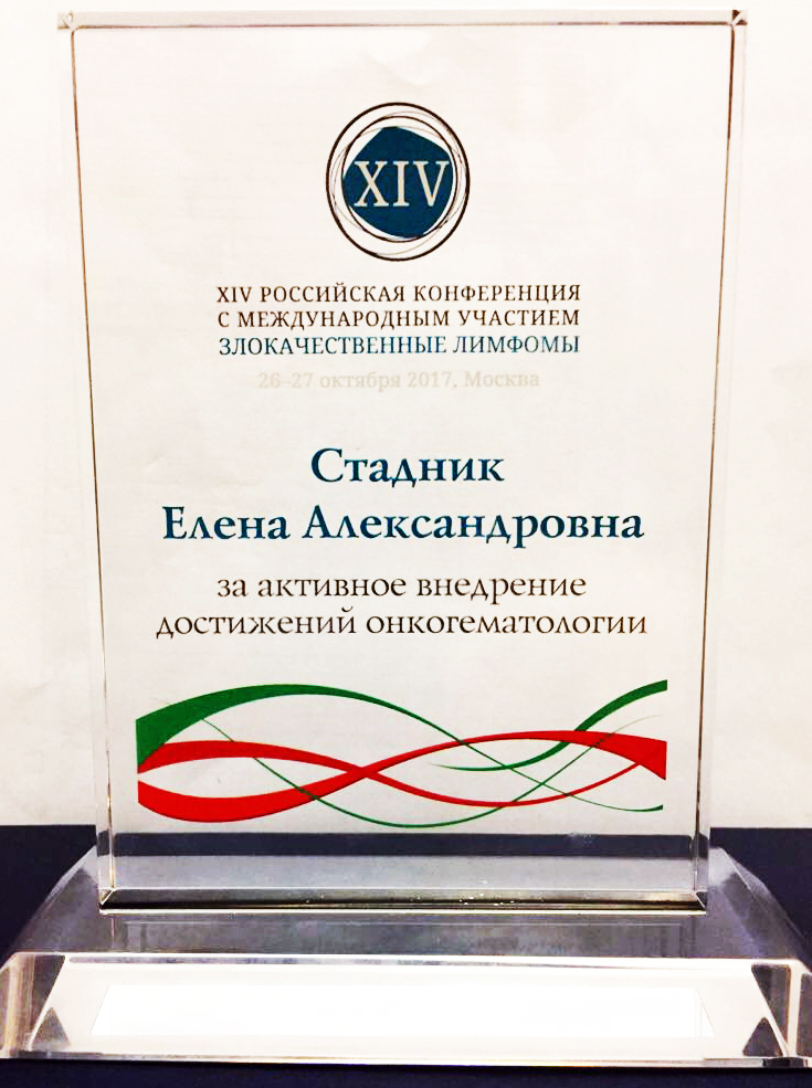 В рамках конференции дипломом и памятным знаком «За активное внедрение достижений онкогематологии» награждена старший научный сотрудник НИЛ онкогематологии, к.м.н. Стадник Елена Александровна.