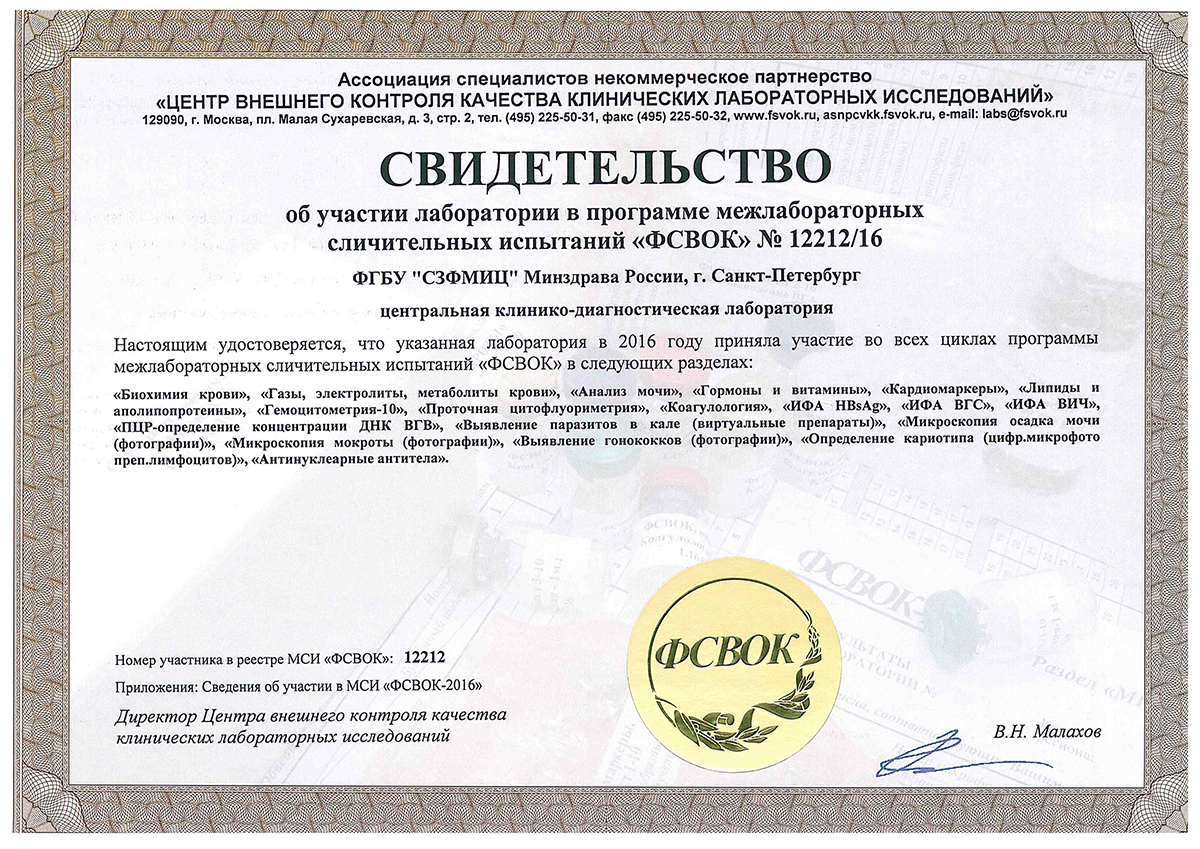 Patients can rest assured knowing that their samples are analyzed in a thoroughly-monitored and highly-controlled environment that adheres to the quality standards approved by the Federal Service of External Quality Assessment as satisfactory for purposes of diagnostic testing.